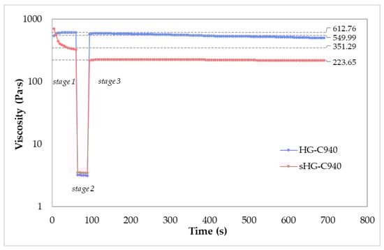 According to the results above, C940 HGs were selected for the study of thixotropy because these systems were the least impacted by sterilization. A three-step test applying low (0.1 s−1), high (100 s−1) and low (0.1 s−1) shear rates for a given time is the best way to evaluate time-dependent changes in viscosity. When the stress was removed in stage 3, HG-C940 recovered 90% of its original viscosity (612.76 vs. 549.99 Pa·s) after 600 s, while the recovery rate of sHG-C940 in the same period was 64% (351.29 vs. 223.65 Pa·s) (Figure 2). Therefore, HG-C940 is not very thixotropic, unlike the sterilized sample that appeared to take some time for the structure to rebuild and become thick again.