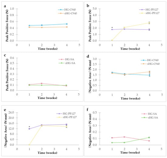 Firmness (a–c) and adhesiveness (d–f) of sterilized (sHG) and non-sterilized (HG) hydrogels based on Carbopol® 940 (C940) (a,d), Pluronic® F–127 (PF127) (b,e), and sodium alginate (SA) (c,f) one, two and four weeks after preparation. Error bars represent mean ± SD (n = 3). * p < 0.05 denotes a significant difference between the sterilized and non-sterilized hydrogels by independent samples Kruskal–Wallis’ test.
