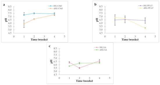 Compared to other formulations, the pH values of C940 HGs were relatively higher as triethanolamine was added dropwise to complete the gelation process. Accordingly, the pH of C940 HGs was close to neutrality, whereas PF127 HGs and SA HGs were found to be slightly acidic. In general, sterilized HGs showed a higher variation in pH values than non-sterilized HGs. Although steam sterilization significantly lowered the pH value of sHG-C940 at first (p = 0.005), this formulation reached its initial value three weeks later. Additionally, there were no significant changes in pH between HG-SA and sHG-SA or over time (p = 0.491).