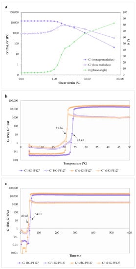 The evaluation of sol-gel transition was only carried out in the case of PF127 HGs. Oscillatory shear rheology was used to study the viscoelastic properties of PF127 HGs, measuring their elastic (or storage) modulus (G′) and viscous (or loss) modulus (G″). Whereas the former gives information about the stored elastic energy, the latter describes the energy dissipated as heat [].