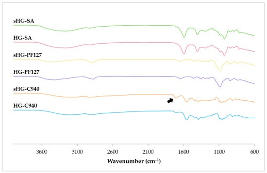 In the FT-IR spectrum of HG-C940, the peak at 1702 cm−1 corresponded to C=O stretching, while absorption at 1546, 1442 and 1394 cm−1 indicated C–O/O–H. Additionally, the peak at 834 cm−1 confirmed the plane bending of C=CH of the acrylate []. Following autoclaving, all the signals were still visible, but the peak associated with carbonyl stretching became more pronounced and shifted to 1698 cm−1 (black arrow). Contrastingly, spectral overlapping was observed for PF127 and SA HGs. The spectrum of HG-PF127 revealed C–H stretching, in-plane O–H bending, and C–O stretching at 2868 cm−1, 1348 cm−1, and 1086 cm−1, respectively []. Moreover, the bending vibration of –CH bonds was observed between 1720 and 1416 cm−1, and C–O–C stretching was registered at 1294 and 1246 cm−1 [,]. The above-mentioned typical bands of PF127 also appeared in the spectrum of sHG-PF127. The spectra of both SA HGs showed a broad absorption band between 3650 and 3000 cm−1, which was assigned to O–H stretching. Other peaks of SA at 1594 cm−1 (C–O asymmetric stretching), 1404 cm−1 (C–O symmetric stretching), 1024 cm−1 (C–O–C stretching), 948 cm−1 (symmetric stretching in the pyranose ring), 884 cm−1 (C–O–C symmetric stretching in 1,4-glycosidic bonds), and 812 cm−1 (flexion vibration in guluronic and mannuronic acid units) were also identified [].