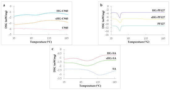 DSC thermograms of Carbopol® 940 (C940) (a), Pluronic® F–127 (PF127) (b), and sodium alginate (SA) (c) and their respective sterilized (sHG) and non-sterilized (HG) hydrogels.