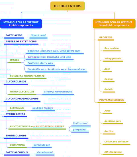 The growing number of compounds used for structuring vegetable oils calls for their categorization. Thus, two large categories are identified: low-molecular-weight oil and polymeric or high-molecular-weight oil gelators (Table 1).
