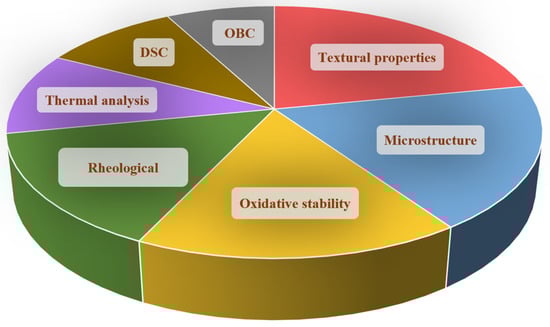 The analysis and characterization of oleogels involve a multi-faceted approach that includes compositional, structural, rheological, thermal, and microstructural analysis. These techniques provide insights into the properties, behavior, and performance of oleogels and can be used to optimize their formulation, processing, and utilization in various applications, including food, pharmaceuticals, and personal care products. Considering the food-grade oleogels analysis, laboratory studies should further consider comprehensive characterization referring to their sensory properties, shelf life, nutritional composition, processing behavior, compatibility, and microbiological safety. Figure 3 presents the most frequently used analysis methods in the case of edible oleogels. For this purpose, several databases were searched for the word “oleogel” and the considered analysis method. Thereafter, the graph was constructed considering the number of obtained hits for each search result.