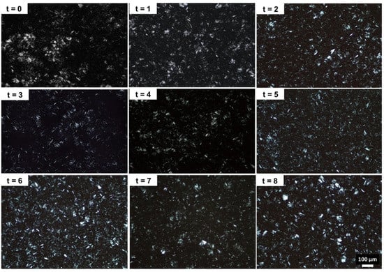 Polarized light microscopy (PLM) images of the monoglyceride oleogels stored at 5 °C over different storage times (t = weeks). PLM images were taken at 25× magnification. Taken from [] with 2023 Copyright Clearance Center, Inc., license.