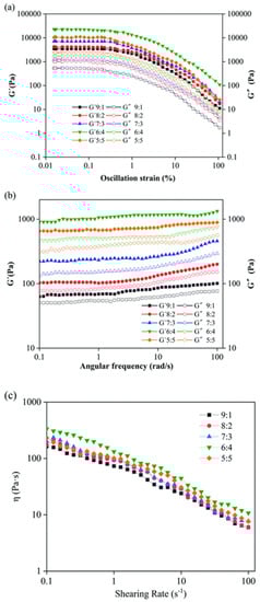 Rheological behavior of oleogels with different oil-to-water ratios. (a) Amplitude sweep, (b) frequency sweep, and (c) flow measurement curves. Taken from [] with 2023 Copyright Clearance Center, Inc., license.