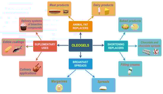 From a technological perspective, oleogels are being explored as a way to overcome challenges in food product development. For example, they can be used in food products as a replacement or for the reduction of solid fats, such as trans fats or hydrogenated fats, to create healthier options without compromising their texture, mouthfeel, and stability [,,,,,,,,]. Oleogels can also be used to encapsulate and deliver bioactive compounds, such as antioxidants or flavors, in food products, providing enhanced stability and controlled-release properties [,,,,,,,,]. Additionally, oleogels can offer new possibilities for product innovation by creating unique textures, structures, and sensory experiences in food products [].