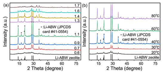 Thus, the Li/Al ratio was fixed at 1.1, while the curing time remained at 24 h. Figure 1b shows the transformation of the lithium-based geopolymer at different temperatures. It can be seen that no molecular sieve is generated when curing below 30 °C. Then, with the temperature reaching 60 °C, the crystallinity of the sample gradually increases. When the temperature is higher than 60 °C, the intensity of the Li-ABW characteristic diffraction peak is basically unchanged, which can be judged as the best formation temperature for lithium zeolite. However, for each sample, the crystallization limit is subject to its original composition; that is, compared with the curing time and temperature, the transformation of the geopolymer in this experiment mainly depended on the Li/Al ratio of the raw materials. Table 1 lists the comparisons between the preparation process of the Li-ABW in this experiment and other experiments. Compared with the process proposed in this chapter, it can be seen that the in-situ conversion method of geological polymers has great advantages, and geological polymers are excellent precursors of zeolite.