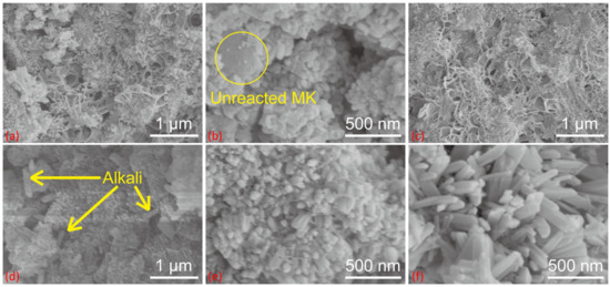 The in-situ conversion of zeolite from geopolymers and its application have been widely studied [19,20,21]. For example, Ye et al. [22] used NaOH to activate MK foaming to prepare geopolymer microspheres and transform them into NaA molecular sieves in situ for CO2 hydrogenation catalyzed by supported Ni, Pt, and Pd. Guan et al. [23] used sodium silicate as the activator in the preparation of MK-based geopolymer; then, the faujasite zeolite was prepared through hydrothermal reaction in a 2 mol/L NaOH solution at 90 °C for 24 h. The compressive strength can reach 11.7 Mpa. Wei et al. [24] obtained the crystallinity of 62.42% cubic zeolite microspheres after curing the MK with 11 M sodium hydroxide at 85 °C for 72 h, and its adsorption capacity of Pb2+ was up to 308.3 mg/g. Such an approach manifests sustainability benefits as the synthesis of geopolymers is more energy- and time-efficient compared to conventional zeolite synthesis [18].