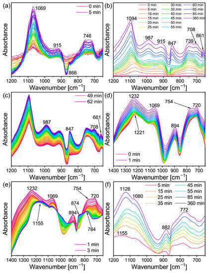 In order to further explore the conversion mechanism of the lithium geopolymer, the slurry was analyzed using in-situ infrared spectroscopy. Figure 3b shows the in-situ infrared image of Li/Al = 1.1 and T = 60 °C when the reaction time is 0–360 min. Using the same recording method as in Figure 3b,f shows the image of Li/Al = 0.6. As the curve displacement of the equipment led to its absorption peak strength rising slowly with the passage of time (which can be seen from Figure 3c), the curve was made independent and was analyzed in the experiment. For the geopolymer, the fingerprint area of 800–1200 cm−1 is more significant. In addition, there are many vibration modes of Si-O-Si in the raw materials (including asymmetric stretching vibration, symmetric stretching vibration, and bending vibration) within 370–1300 cm−1 [35]. In conclusion, combined with the instrument parameters, the measuring range was 650–1200 cm−1. It can be seen from Figure 3a,b that the absorption peak first appeared at 1069 cm−1 in 0–5 min, shifted to 1078 cm−1 in 30 min, and then gradually disappeared and merged into the strong 1094 cm−1. The vanishment of 1069 cm−1 is considered to be the dissolution of the Si-O-Si bond in the MK under the action of alkali [36].