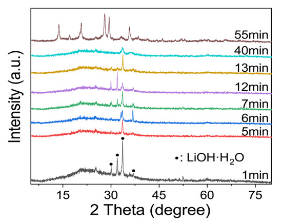 There were obvious changes in the in-situ infrared image after approximately 50–60 min, as can be seen in Figure 3b. As shown in Figure 3c, the 49–62 min ATR-FT-IR image was separated. There are obvious adsorption peaks at 987 cm−1, 847 cm−1, 708 cm−1, and 661 cm−1, and there is no sharp change when the reaction lasts for 360 min (the top curve in Figure 3b). On one hand, the geopolymer slurry is actually solidified during the induction period of zeolite formation [40], which means that the transformation may occur during curing if the relevant conditions are suitable. On the other hand, these peaks appeared almost simultaneously. This indicated that the geopolymer may have been transformed at this time point. In addition, Figure 4 can also prove this inference, even if the intensity of the characteristic peak is low. At the beginning of the reaction, a relatively excessive amount of lithium hydroxide monohydrate (JPCDS card No. 01-075-0883) was detected in the sample, which also proved that the low-temperature cryogenic method of liquid nitrogen can suspend the geopolymerization reaction at the corresponding time point. As can be seen in the figure, with the progress of the geopolymerization reaction, the lithium hydroxide monohydrate continues to dissolve, its characteristic peak gradually disappears, and the entire system transforms into an amorphous geological polymer. The characteristic peak of the Li-ABW-type molecular sieve appears until the reaction proceeds to 55 min. It can be seen from this that, under the conditions of this experiment, when the reaction time is more than 55 min, the crystallization of the zeolite is actually carried out synchronously with the solidification and curing of the geopolymer. Moreover, the absorption peak at 746 cm−1 shifts towards the low wave number during the reaction; this could be interpreted as a change in the bond length and angle of the Si-O-Si in the gel [41].