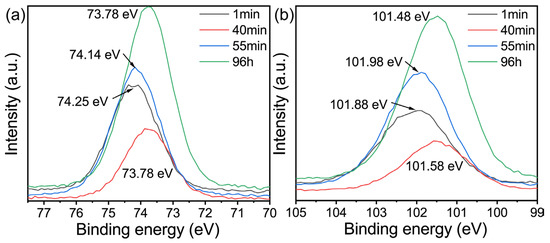 According to a previous report [27,52], there are usually four chemical forms of samples in geological polymers and zeolites. Therefore, when performing peak fitting on the O 1s high-resolution spectrum, Si-OH, Si-O-Al, Si-O-Si, and Si-O-Li are selected. From the beginning of the reaction until the conversion of the geopolymer, the electron binding energy decreased, with Al decreasing from 74.25 eV to 73.78 eV, while Si decreased from 101.88 eV to 101.58 eV, which may be due to the increase in the release of Si and Al elements from the metakaolin, indicating that geopolymerization is mainly carried out.