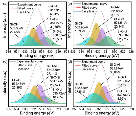 From the peak fitting of the high-resolution spectrum of O 1s, as shown in Figure 7, the following inference can be drawn: Firstly, it can be seen that the content of Si-O-Al significantly increased from the beginning of the reaction to the beginning of crystallization, which may be due to the relatively faster dissolution rate of Al in the early stage of the geopolymerization reaction. Secondly, Figure 7b,c show that the changes in the content of the Si-O-Al and Si-O-Si bonds before and after the formation of zeolite. With the dissolution of more Si, and under the control of the main crystal form Li4Al4Si4O16·4H2O (this can be seen from XRD images), the content of these two bonds tends to be consistent. Finally, it can be seen from Figure 7d that after deducting the content of Si-O-Li corresponding to Si-O-Al in the gel, the content of the Si-O-Si and Si-O-Al bonds is almost the same, which also explains the contribution of the zeolite transformation in Figure 7c to the convergence of the content of the Si-O-Si and Si-O-Al bonds.