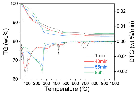 Figure 8 shows the TG-DTG curves of the samples with reaction times of 1 min, 40 min, 55 min, and 96 h. According to the figure, there are three weight loss intervals for the geological polymer samples: 25–200 °C, 200–500 °C, and 600–800 °C, which correspond to the mass loss peak of the geopolymer gel L-A-S-H, hydrotalcite [53], a mass loss peak in which the lithium hydroxide monohydrate loses crystalline water and decomposes, and a mass loss peak in lithium carbonate, respectively. The weight loss range of the molecular sieve samples mainly occurs at 100–300 °C, and the corresponding crystal form of the molecular sieve collapses from Li4Al4Si4O16·4H2O to Li2Al2Si2O8·0.18H2O after water loss. It can be seen that the formation of zeolite has significantly changed the properties of the lithium-based geopolymer: First, in general, the zeolite generated in situ by the geopolymer usually grows on the surface of the geopolymer gel, and the zeolite generated in situ completely seals the L-A-S-H gel to keep it unchanged in the weight loss temperature range of the unconverted lithium-based geopolymer. Secondly, the formation of zeolite induced the formation of geopolymer gel to a certain extent, making the original weight loss segment of the hydrotalcite disappear. Finally, the addition of lithium hydroxide monohydrate is relatively excessive, while the conversion group has no significant changes in the corresponding dehydration and decomposition stages of the lithium hydroxide monohydrate, which may also be related to the fixation of the zeolite on the alkali.