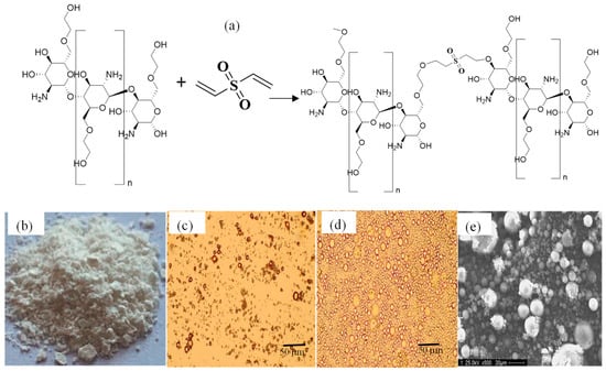 (a) Schematic presentation of the synthesis of p(GC) microgels, (b) photograph of 10% DVS crosslinked p(GC) microgels, optical microscope images of (c) dry, (d) swollen p(GC) microgels, and (e) scanning electron microscope (SEM) images of p(GC) microgels, respectively.