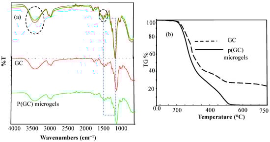 (a) FT-IR spectra of GC and p(GC) microgels and (b) thermal degradation (TG %) of GC and p(GC) microgels.