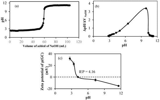 The potentiometric titration of p(GC) microgels was performed in 0.01 M 50 mL KNO3 solution using 0.1 M NaOH and 0.1 M HCl. It was found p(GC) microgels have one pKa value at pH 9.9 from amine, as shown in Figure 3a,b as most of the hydroxy groups were used in crosslinking with DVS during microsphere formation. To determine the isoelectric point of p(GC) microgels, the zeta potentials values of p(GC) microgels in different pH solutions were measured and the results were shown in Figure 3c. It is apparent that p(GC) microgels had a positive zeta potential value of +22.5 mV at pH 3.4. Isoelectric points (IEPs) for p(GC) microgels were measured at pH 4.16, where positive and negative charges are equal.