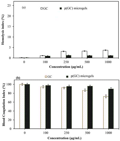 Biomaterials, as they are frequently in contact with blood, are required to be biocompatible and should not adversely affect the normal physiologic functions of the blood cells. Therefore, the hemocompatibility of p(GC) microgels was evaluated by hemolysis and blood clotting assays, and their results are represented in Figure 4a,b, respectively. Hemolysis is a pathological condition that causes the release of the hemoglobin molecule through the disintegration of the erythrocyte cell membrane and causes many complications such as anemia, jaundice, weakness, and enlarged liver []. In the literature, the hemolysis ratio of materials is determined as follows: <2%: non-hemolytic, 2–5%: slightly hemolytic, and >5%: hemolytic material []. As shown in Figure 4a, the hemolysis ratio of GC was determined as 1.1 ± 0.1%, 3.13 ± 0.2%, 3.28 ± 0.2%, and 3.68 ± 0.2%, while the hemolysis ratios of p(GC) microgels were estimated as 0.9 ± 0.1%, 1.22 ± 0.2%, 1.12 ± 0.2%, and 1.15 ± 0.1%, at 100, 250, 500, and 1000 μg/mL concentrations, respectively. Apparently, the GC was slightly hemolytic with >3% hemolysis ratio at 250, 500, and 1000 μg/mL concentrations. On the other hand, p(GC) microgels were non-hemolytic in up to 1000 μg/mL concentrations with a <2% hemolysis ratio at 1000 μg/mL. These results clearly show that p(GC) microgels even at a 1 mg/mL concentration were compatible with human blood. The blood clotting test was another important parameter performed to investigate the interaction between materials and the clotting function of the blood.