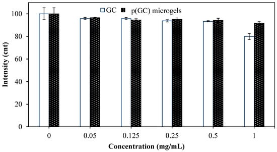 As seen in Figure 5, the fluorescence intensity decreased with increased concentrations of GC-based materials. Apparently, GC polymer and p(GC) microgels did not have any significant effect on the fluorescence intensity of fibrinogen up to 0.5 mg/mL concentrations. However, GC at 1 mg/mL caused a 20.12 ± 2.6% decrease in fluorescence intensity. As p(GC) microgels at the same concentration interacted with fibrinogen, the decrease in fibrinogen peak is only 8.3 ± 1%, which was quite less than that of GC polymer. Fibrinogen interaction assay results are coherent with the blood clotting index values of GC-based materials. Overall, blood compatibility studies indicate that p(GC) microgels are compatible with blood and could be safely used in blood-contacting applications.