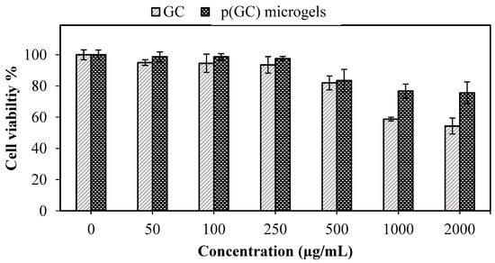 For the sample preparation, 20 mg of GC and p(GC) microgels were weighed and suspended in 10 mL of DMEM to obtain 2 mg/mL of initial concentrations. Then, these samples were diluted in DMEM to obtain 1000, 500, 250, 100, and 50 μg/mL concentrations of samples. L929 fibroblasts were counted and 100 μL of cell suspension containing approximately 5 × 103 cells/mL were seeded onto a 96-well plate and incubated for 20–24 h at 37 °C in a CO2 incubator. After the incubation time, the cells were checked, old media were discarded, and immediately 0.1 mL of GC-based materials were placed onto the wells and the plate was incubated for 24 h. After this, the media were removed, and the wells were washed with phosphate-buffered saline (PBS) solution once. Then, 100 μL of 0.5 mg/mL MTT solution prepared in DMEM was added to each well and the plate was kept in the dark for 3 h. Finally, 200 μL of DMSO was added to the wells to dissolve the dark blue formazan crystals, mixed thoroughly, and kept for 20 min to homogenize the color. Optical density was measured by an ELISA plate reader (Multiskan™ FC, Microplate Photometer, Thermo Fisher Scientific, Waltham, MA, USA) at 590 nm.