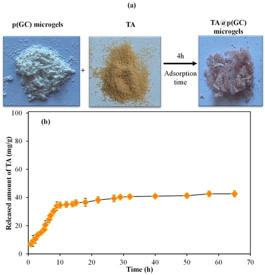 To corroborate the drug carrier abilities of p(GC) microgels, highly antioxidant polyphenol TA was loaded into p(GC) microgels by the absorption technique. The TA loading into GC microgels and the TA release from TA@p(GC) microgels results are illustrated in Figure 7a,b, respectively.