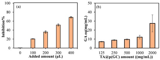 (a) The % inhibition values of TA release medium taken from TA@p(GC) microgels release media in the first 9 h tested and tested via TEAC assay, and (b) total phenol GA equivalency of TA@p(GC) microgels at different concentrations.