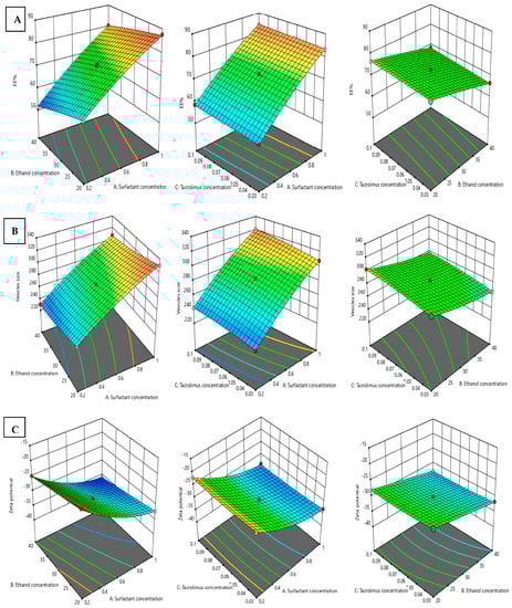 where X1 is the concentration of surfactant, X2 is the concentration of ethanol, and X3 is the concentration of TAC. The response surface curves of the EE% values from the interaction of different independent variables are shown in Figure 1A and Figure 2A.