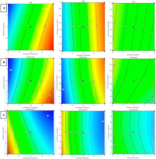 Contour graph for the effect of independent factors on different responses, EE% (A), vesicle size (B), and zeta potential (C) of PRED–TAC-loaded TETSMs. Red dots indicate the replicates in our design.