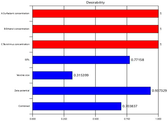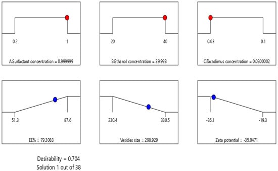 A Box–Behnken design was utilized to optimize the formulation variables for creating PRED-loaded TETSMs with the goal of achieving high encapsulation efficiency, small vesicle size, and high zeta potential. Experiments were conducted using Design Expert software, with 17 total experiments conducted, including 13 at the midpoint of each edge of a multidimensional cube and 4 replicates of the cube’s center point. Three independent variables were estimated, including surfactant concentration, ethanol concentration, and tacrolimus concentration. The dependent variables were encapsulation efficiency, vesicle size, and zeta potential. The study design and composition of the prepared PRED-loaded TETSMs are presented in Table 1 and Table 10. The optimized formula was selected by Design Expert software based on the highest value of desirability for achieving our goal of high encapsulation efficiency, high zeta potential, and small particle size. The selected optimized formula was fabricated and assessed again for different responses to detect the accuracy of the model.