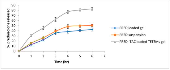 The release profile of PRED is illustrated in Figure 4. The release profile showed that the PRED–TAC-loaded TETSMs gel achieved higher released PRED (82.93% ± 2.75) than the PRED-loaded gel (42.56% ± 3.11) and PRED suspension (50.45% ± 2.12). The higher release achieved could be attributed to the increased thermodynamic activity of PRED solubilized in the TETSMs lipid bilayers, and to the nanosize of the vesicles that led to higher release []. All gel formulations exhibited Higuchi diffusion model release.