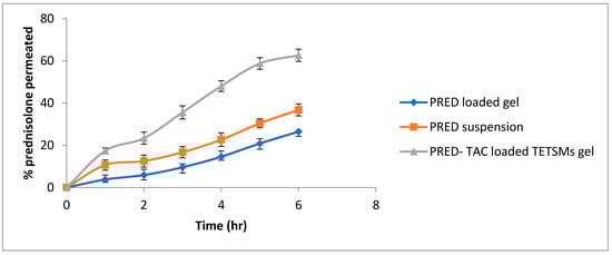 The permeation profile of PRED from the optimized-formula-loaded gel compared to PRED-loaded gel and PRED suspension is illustrated in Figure 5, while permeation parameters are presented in Table 5. Preparations of PRED–TAC-loaded TETSMs gels showed the highest percent of PRED (62.65% ± 2.87) permeated through the skin, compared to PRED-loaded gels and PRED suspension (26.5% ± 2.21 and 36.76% ± 1.98, respectively), and this is due to the lower rigidity of the vesicles, which permits their squashing between cells. The combined effect of the presence of both ethanol and edge activator (i.e., surfactant) enhanced the transepidermal flux of the gel formulation (45.27± 2.87 × 104 µg/cm2·h−1) compared to the PRED-loaded gels and PRED suspension.