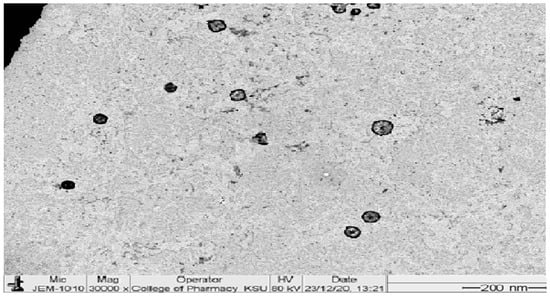 The transmission electron image of the optimum formula is represented in Figure 6. The image shows spherical vesicles with large aqueous cores. The vesicles are smooth, well defined, and non-aggregated, confirming their stability. The image is also in agreement with the size analysis data.