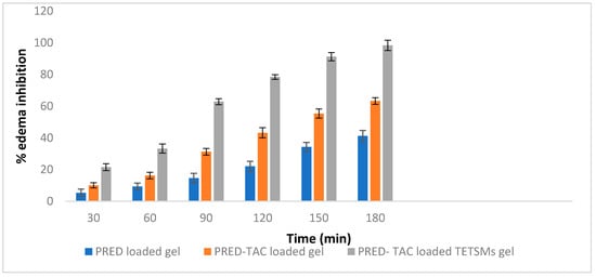The rat hind paw edema model is one of the most used anti-inflammatory models to study the effect of topically applied anti-inflammatory agents. The percent edema inhibition of PRED-loaded gel, PRED–TAC-loaded gel, and PRED–TAC-loaded TETSMs gel are shown in Table 7 and Figure 7. It was noted that PRED–TAC-loaded TETSMs gel achieved the highest rate of percent inhibition (p < 0.05) among the other gel formulations (98.34% in 180 min), followed by PRED–TAC-loaded gel (63.26%), and PRED-loaded gel (41.25%).