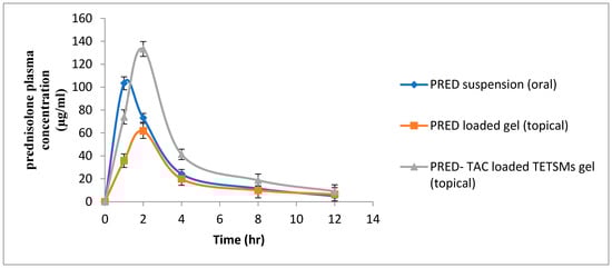 Pharmacokinetic parameters of PRED-containing gel formulations and oral PRED suspension are shown in Table 8. Plasma PRED profiles are illustrated in Figure 8. It is noticed that PRED–TAC-loaded TETSMs gel achieved higher pharmacokinetic parameters (p < 0.05) compared to PRED-loaded gel (topical) and PRED oral suspension in terms of Cmax and AUC 0-∞ (133.266 ± 6.469 µg/mL, 538.922 ± 49.052 µg·h/mL), (1.3 and 2.2-fold increase in Cmax and 1.47 and 1.88 fold increase in AUC 0-∞ compared to oral suspension and PRED gel, respectively), with significance (p < 0.05) according to ANOVA results in Table 9. The higher systemic concentration of PRED after application of PRED–TAC-loaded TETSMs gel than after oral administration could be attributed to the presence of edge activators in the TETSMs composition which increase skin penetration by enhancing the fluidity of the TETSMs phospholipid bilayer, making them ultradeformable and extremely elastic, and therefore facilitating their squeezing into the skin pores [,]. Additionally, the presence of ethanol in TETSMs improves drug penetration through the minute holes created in the stratum corneum as a result of fluidization by enhancing the lipids fluidity and decreasing the density of the lipid bilayer []. Moreover, the addition of TAC to TETSMs gel formulations resulted in higher pharmacokinetic parameters of PRED, as TAC is previously reported to increase corticosteroids accumulation []. These findings support the fact that transdermal delivery bypasses first-pass metabolism for many active ingredients including corticosteroids.