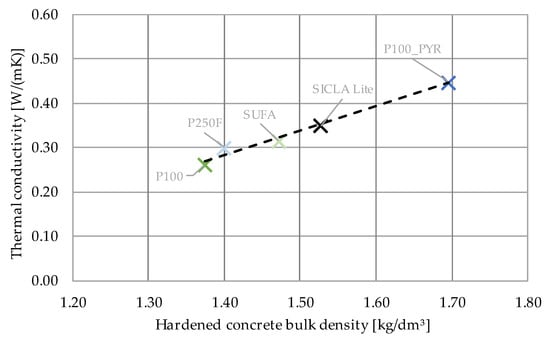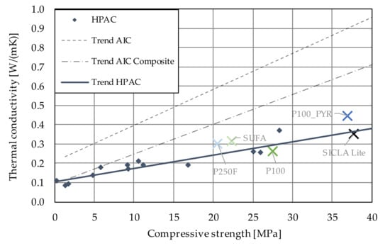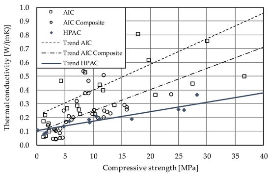 Because the aerogel content was the same for each mixture, the differences regarding thermal conductivity must depend on the following parameters: (1) The conductivity of the granule itself may influence the conductivity of the composite material. (2) Aerogel granules may be ground while mixing, changing the amount of air voids in the composite as the intact aerogel particles convert to powder. (3) In concrete, air voids naturally occur as a result of the hydration process, where water is bonded chemically and physically. Thus, the water–cement ratio will influence the pore structure. Concretes with a more porous structure tend to have a lower thermal conductivity. It would not be sufficient to refer to the air void content of fresh concrete (see Table 6), as micropores develop during hydration. It can be concluded that parameters (2) and (3) can be revealed by the bulk density of hardened concrete. As shown in Figure 12, thermal conductivity correlates to the bulk density of the specimens. The influences of the different aerogels were not pronounced, which was expected due to the similar thermal conductivities found during the characterization of the granules. In Figure 13, the results of the research presented within this paper are plotted against the trends taken from Figure 1. It becomes obvious that the results fit the trend for all HPAC investigations so far. Thus, all aerogels investigated in this study are suitable for the production of high-performance aerogel concrete. Beyond that, these concretes show an improved thermal insulation performance in comparison with normal concrete (ρ = 2000 kg/m3, fck = 8–100 MPa, λ = 1.35 W/mK) [] or even lightweight concrete with similar properties (ρ = 1100 kg/m3, fck = 20–25 MPa, λ = 0.55 W/mK) [].