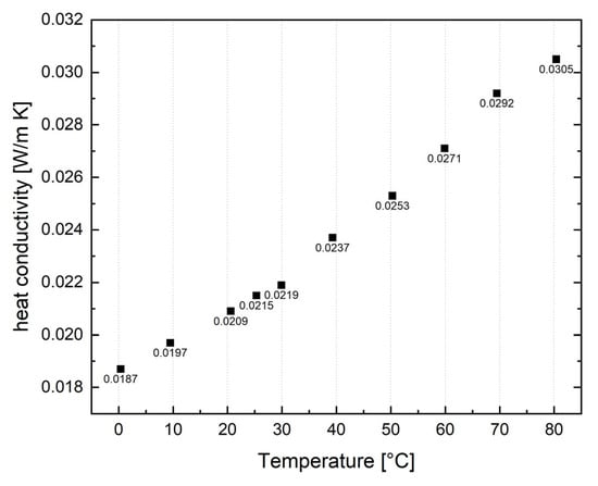Due to the limited amount of aerogel available for proper thermal conductivity measurements, only a few samples could be measured. The thermal conductivity of all samples is very similar and around 0.021 W/(m K), both from the performed measurement and the data provided by the supplier, as aerogels are generally very good thermal insulators. In order to show temperature dependence, P100 was measured accordingly, as seen in Figure 3. Expectedly, higher temperatures lead to a slight increase in thermal conductivity.
