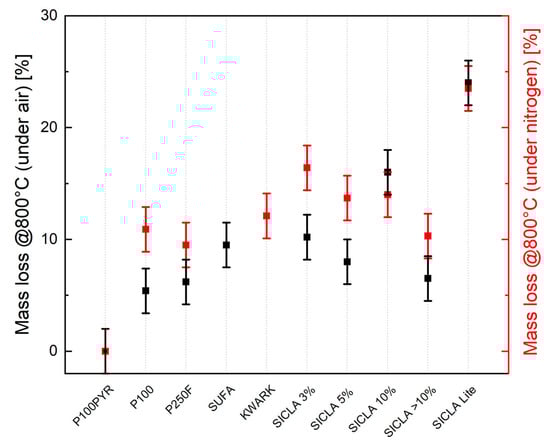 Mass loss of aerogels under air or nitrogen, with SUFA under nitrogen out of range (>70%).