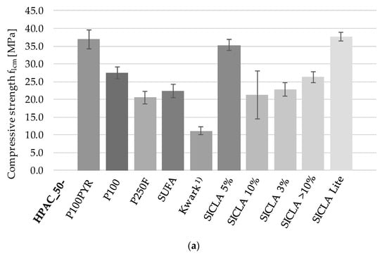 Figure 5a displays the results of the compressive strength tests. The compressive strength of HPAC_50-SICLA Lite (37.67 MPa) was the highest and even higher than that of HPAC_50-P100 (27.47 MPa), closely followed by HPAC_50-P100PYR with 36.95 MPa and HPAC_50-SICLA 5% with 35.34 MPa. HPAC_50-Kwark specimens showed the lowest compressive strength (11.09 MPa), while the strength of the other specimens ranged from 20.55 MPa to 26.33 MPa.