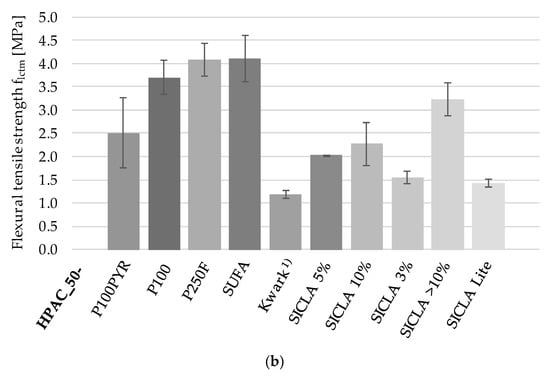 The observations of flexural tensile strength paint a different picture and are displayed in Figure 5b: The strength of HPAC_50-P250F and HPAC_50-SUFA were comparable (~4.1 MPa) and higher than that of HPAC_50-P100 (3.7 MPa) and HPAC_50-SICLA > 10% (3.23 MPa), while the specimens of the other mixtures showed much lower strengths (1.2 to 2.5 MPa). The specimens with noticeably high compressive strengths, HPAC_50-P100PYR, HPAC_50-SICLA 5% and –SICLA Lite, showed relatively low values for flexural tensile strength. Similarly to its compressive strength values, HPAC_50-Kwark exhibited the lowest value, with 1.18 MPa.