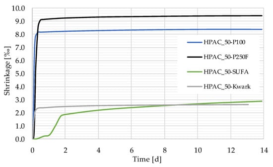 Figure 6 shows the shrinkage strains of different concrete mixtures within the first 14 days. The shrinkage strains of HPAC_50-P100, -P250F and -Kwark are similar regarding the shape of their curves, with a steep rise within the first 12 h, followed by a sudden knee and an asymptotical shape until the end of the measurement after 14 d. However, the thresholds of the shrinkage deformations show significant differences, varying between 2.62‰ and 9.44‰. The curve shape for HPAC_50-SUFA is different from the others, showing only a slight rise during the first 24 h, followed by a bigger increase up to the end of the second day and an asymptotic shape to the threshold of 2.87‰. The reference concrete HPAC_50-P100 exhibits a similarly shaped curve to that of -P250F and reaches a shrinkage value of 8.40‰.