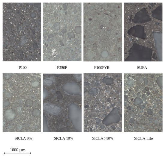 In order to evaluate the hardened concrete visually, the samples were investigated with a light microscope (ZEISS Axio Observer Z1, Oberkochen, Germany). This test was primarily conducted to obtain information about the transition zone between the cement matrix and the aerogel particles and the possible resulting influences on concrete strength, as mentioned in Section 1. As can be seen in Figure 7, the concrete specimens differ widely from each other. HPAC_50-SUFA and HPAC_50-SICLA 10% exhibit larger aerogel particles than the other specimens, and the SUFA granule has a striking angular shape. However, this might be due to different grinding/crushing methods used to obtain the particles. The cement matrices of the mixtures showed different shades of grey, which is remarkable since the mixture compositions were the same. No correlation was observed with the water content in the mixture. With regards to the transition zone, it can be seen that the SUFA, SICLA > 10% and SICLA Lite particles are framed in an area of cement paste that is brighter than the regular areas of the matrix. The particles of these mixtures also appear to be embedded with sharper edges than the particles of the other mixtures, which apparently are embedded more homogenously or without any sharp transition. The matrix of P100PYR shows grey streaks around the aerogel particles.