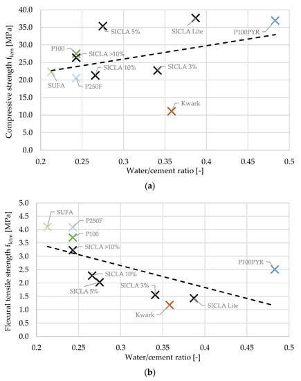 Relation between water–cement ratio and (a) compressive strength and (b) flexural tensile strength.
