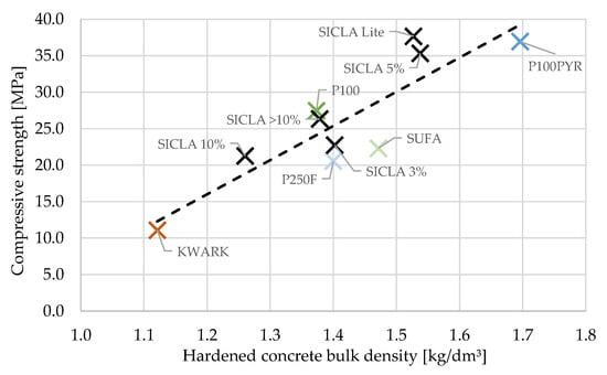 Opposed to this, the findings on the relation between the density of hardened concrete and compression strength are in agreement with the behavior of HPAC described in the literature [] and the general dependency of the compressive strength on the density of concretes. As can be seen from Figure 9, a linear correlation was found with R2 = 0.76; no relevant trend was observed regarding the relation between the density of hardened concrete and flexural tensile strength.