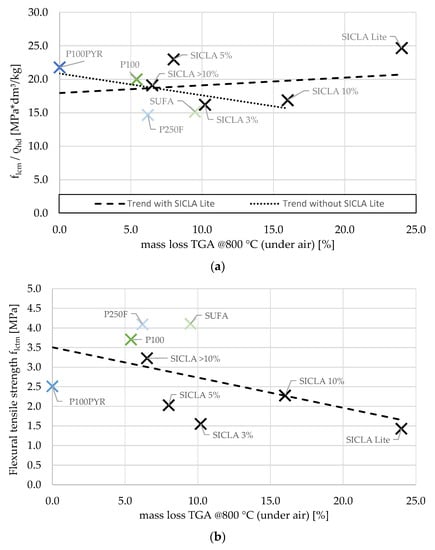 Relation between mass loss in thermogravimetric analysis at 800 °C (under air) and (a) compressive strength normalized to density of hardened concrete and (b) flexural tensile strength.