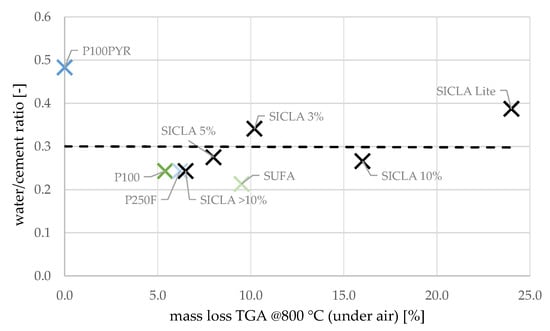 Relation between mass loss in thermogravimetric analysis at 800 °C (under air) and water–cement ratio.