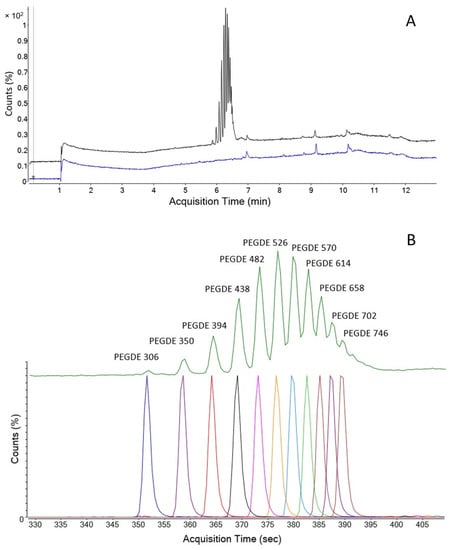 | PEGDE 394 | C18H34O9 | 394.2203 | 395.2275 | 412.2541 | 413.2568 |