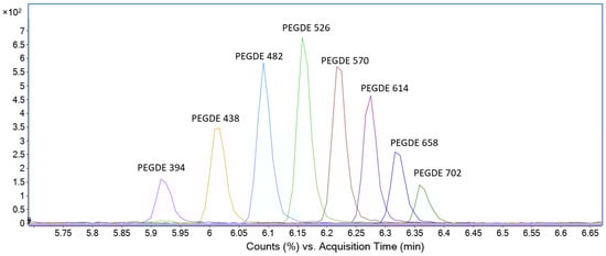 | PEGDE 614 | C28H54O14 | 614.3514 | 615.3586 | 632.3852 | 633.3897 |