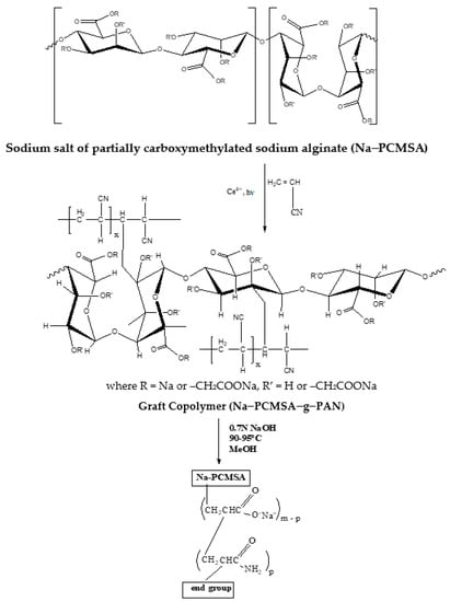 - Patel, G.M.; Patel, C.P.; Trivedi, H.C. Ceric-induced grafting of methyl acrylate onto sodium salt of partially carboxymethylated sodium alginate. Eur. Polym. J. 1999, 35, 201–208. [Google Scholar] [CrossRef]