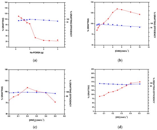 The effect of the amount of Na–PCMSA (0.2 g–3.0 g) on the grafting yields (%G and %GE) is shown in Figure 2a. It is evident from the figure that the value of %G decreases with an increasing amount of Na–PCMSA. However, the value of %GE increases very slowly in the beginning up to 1.0 g. of Na–PCMSA; thereafter, it decreases with increased amounts of Na–PCMSA. The continuous decrease in %G is traced to the fact that with an increasing amount of concentration of Na–PCMSA, the weight of the grafted PAN chains will increase, resulting in a decrease in the monomer-to-backbone ratio. Besides increasing the amount of Na–PCMSA, the formation of a greater number of macroradicals takes place, thereby making the termination rate of photo-graft copolymerization faster than the rate of initiation, as a result of which %GE also decreases. In the literature, similar outcomes have previously been documented [,,].