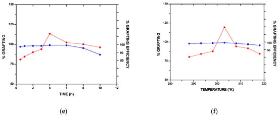 The influence of photo-polymerization time on the yields of grafting was studied by varying the reaction time from 0.5 h to 10 h keeping other variables such as temperature, amount of backbone, and concentrations of monomer, photo-initiator, and nitric acid constant. The results of this experiment are depicted in Figure 2e. It is seen from the figure that %G increased progressively with an increase in reaction time up to 4 h, reaching a maximum value of %G to be 113.35%; the value of the percent grafting efficiency (%GE) also increased very slowly, and the highest value obtained was 98.87% at 4 h.